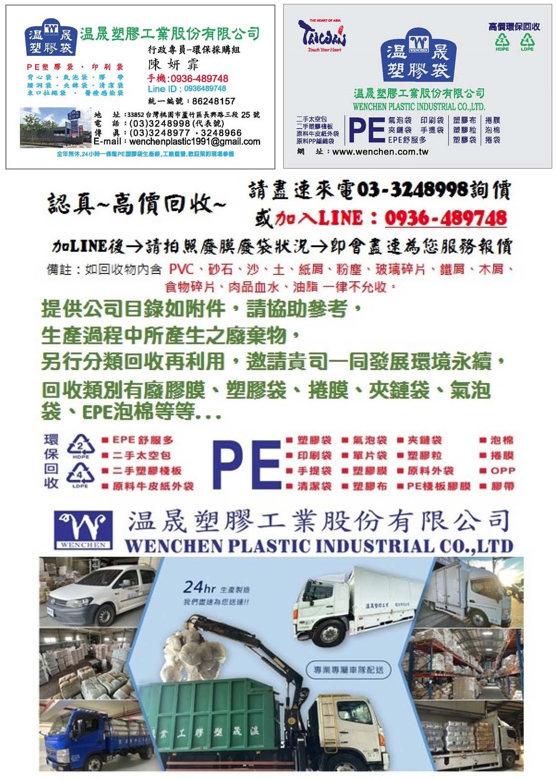 如有PE袋回收等相关问题,请直接电洽:03-3248998